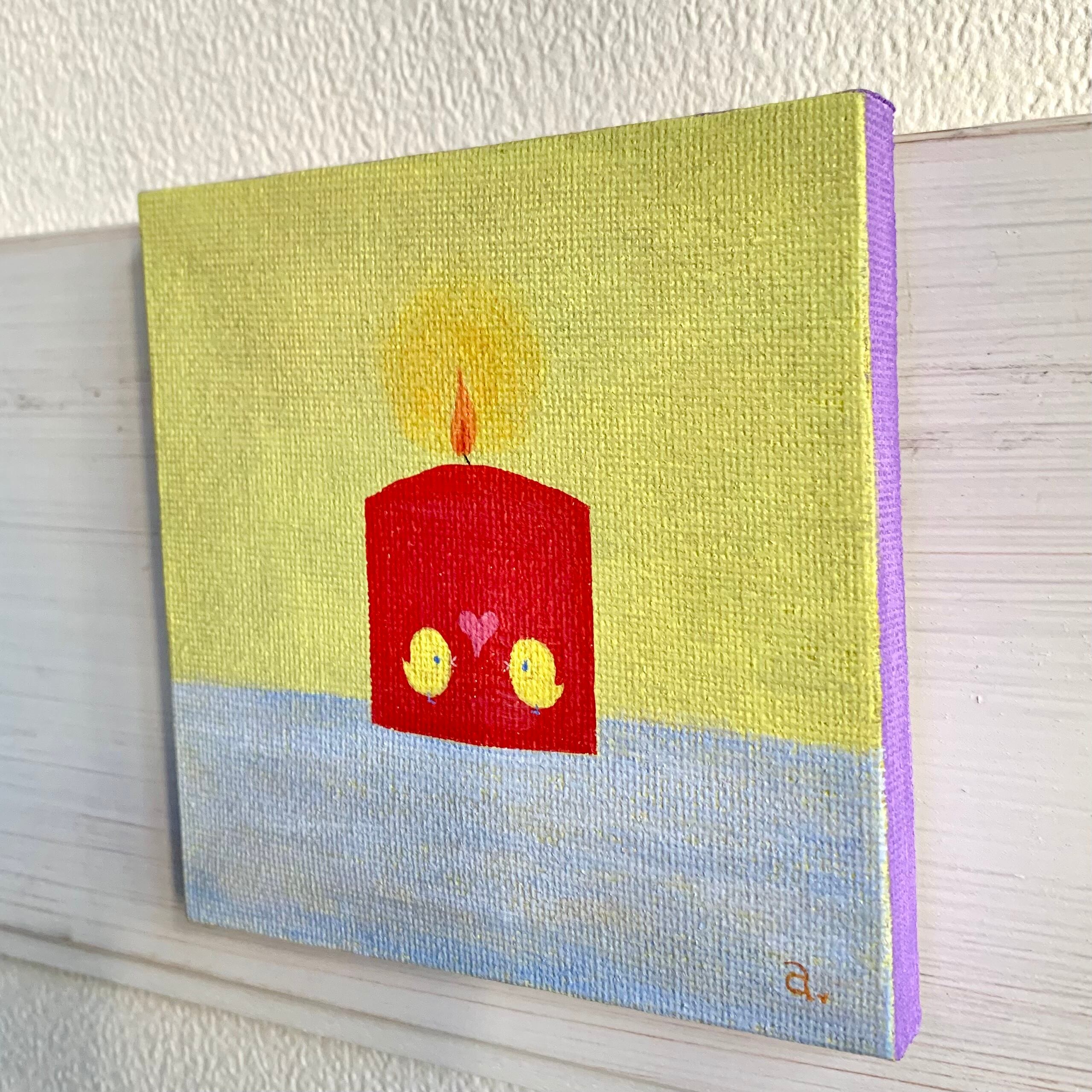 10㎝角の小さなキャンバスに、ひよこ柄の真っ赤なキャンドルを描きました。